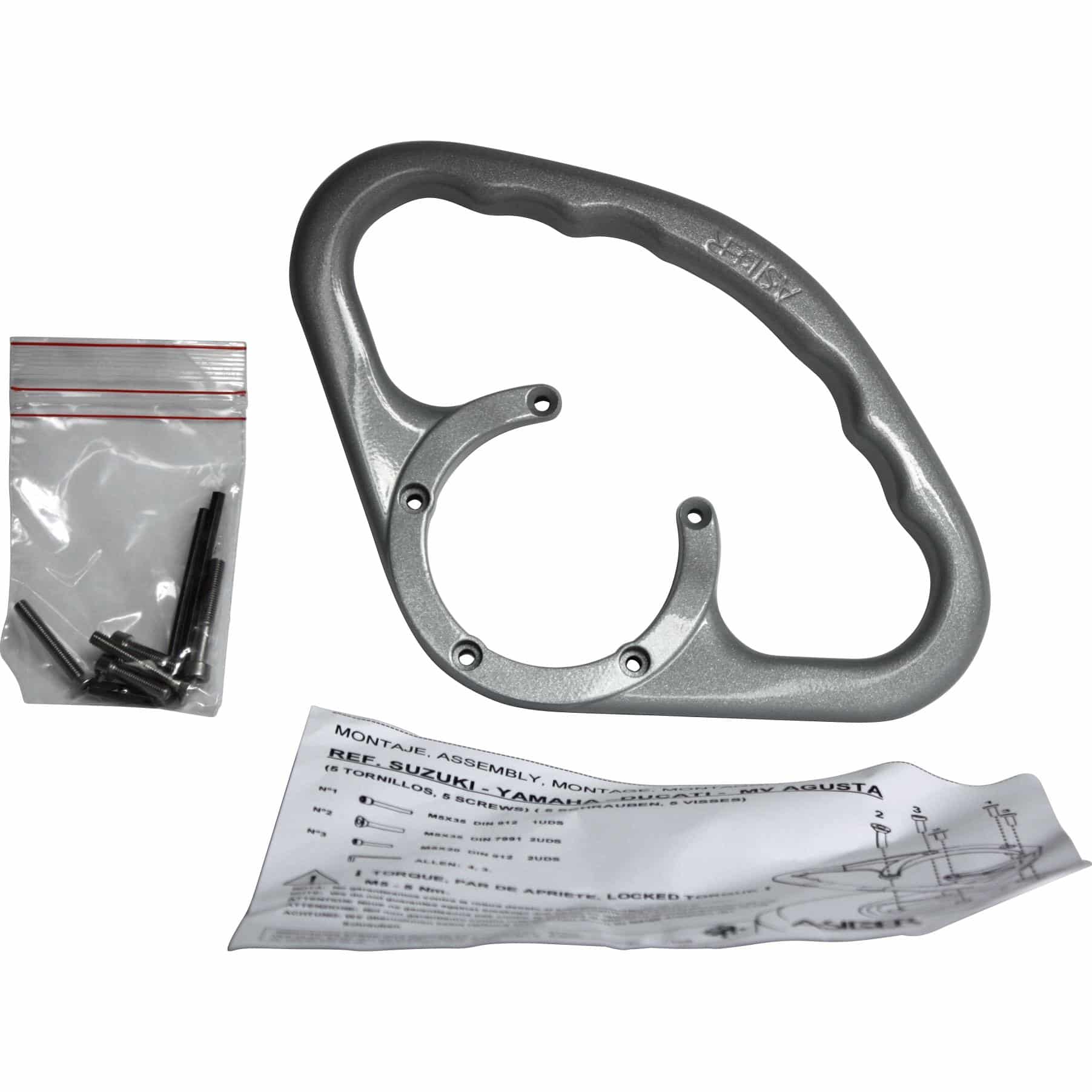 Der Haltegriff wird mittels fünf stabiler Schrauben an dafür vorgesehenen Stellen am Motorradrahmen, an der Sitzbankbefestigung oder an dafür vorgesehenen Halterungen montiert. Die präzise 5-Schrauben-Aufnahme sorgt für eine extrem sichere und vibrationsarme Befestigung.