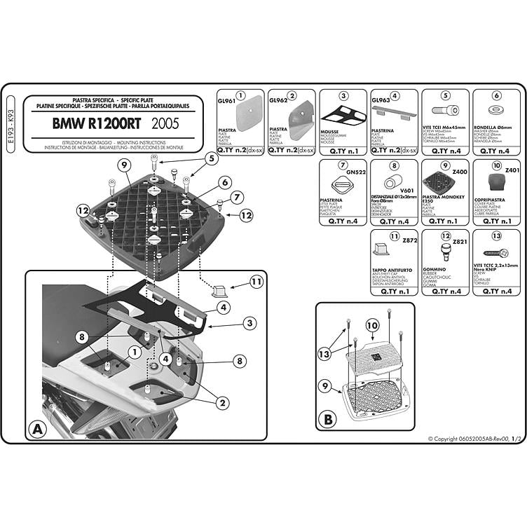 Die Givi TC-Trägerplatte Monokey® E193 ist speziell für die BMW R 1200 RT Modelle der Baujahre 2005 bis 2013 konzipiert. Eine korrekte Montage ist entscheidend für die Sicherheit und Funktionalität. Die Platte wird an den bereits vorhandenen Befestigungspunkten am Heck Ihres Motorrads montiert. Es ist ratsam, die beiliegende Montageanleitung von Givi sorgfältig zu studieren und gegebenenfalls auf die Unterstützung eines erfahrenen Motorradtechnikers zurückzugreifen, um eine fachgerechte Installation zu gewährleisten.