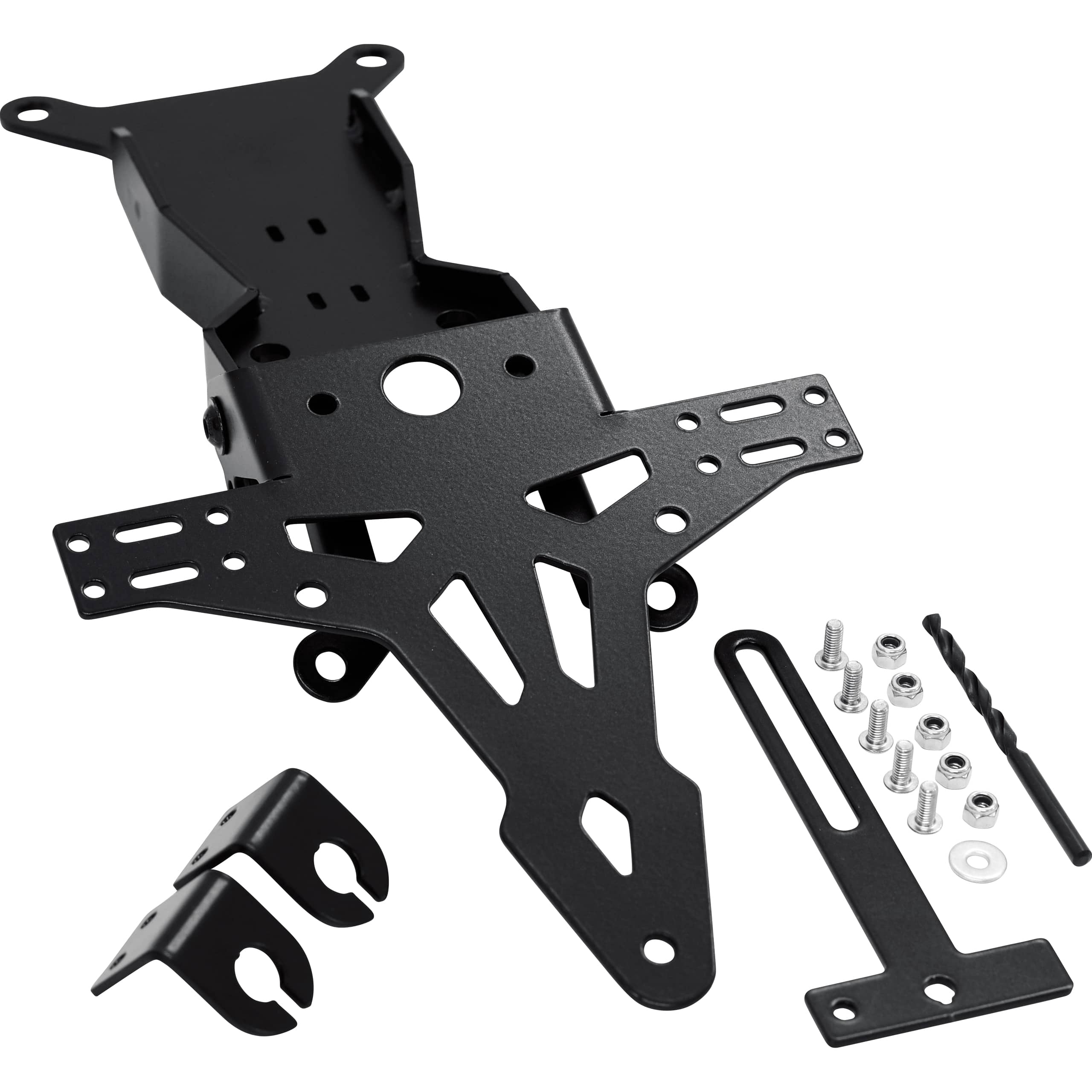 Die Konstruktion des Halters selbst ist auf Funktionalität und eine klare Linienführung ausgelegt. Die Montagepunkte sind präzise gefertigt, um eine nahtlose Integration in die bestehende Fahrzeugstruktur zu ermöglichen. Dies bedeutet, dass Sie den originalen Kennzeichenträger ohne aufwendige Anpassungsarbeiten oder die Notwendigkeit zusätzlicher Bohrungen an Ihrem Motorrad ersetzen können. Die Befestigungspunkte für die Blinker und die Kennzeichenbeleuchtung sind so konzipiert, dass sie die Montage dieser Komponenten erleichtern und gleichzeitig eine sichere und ordentliche Positionierung gewährleisten.
