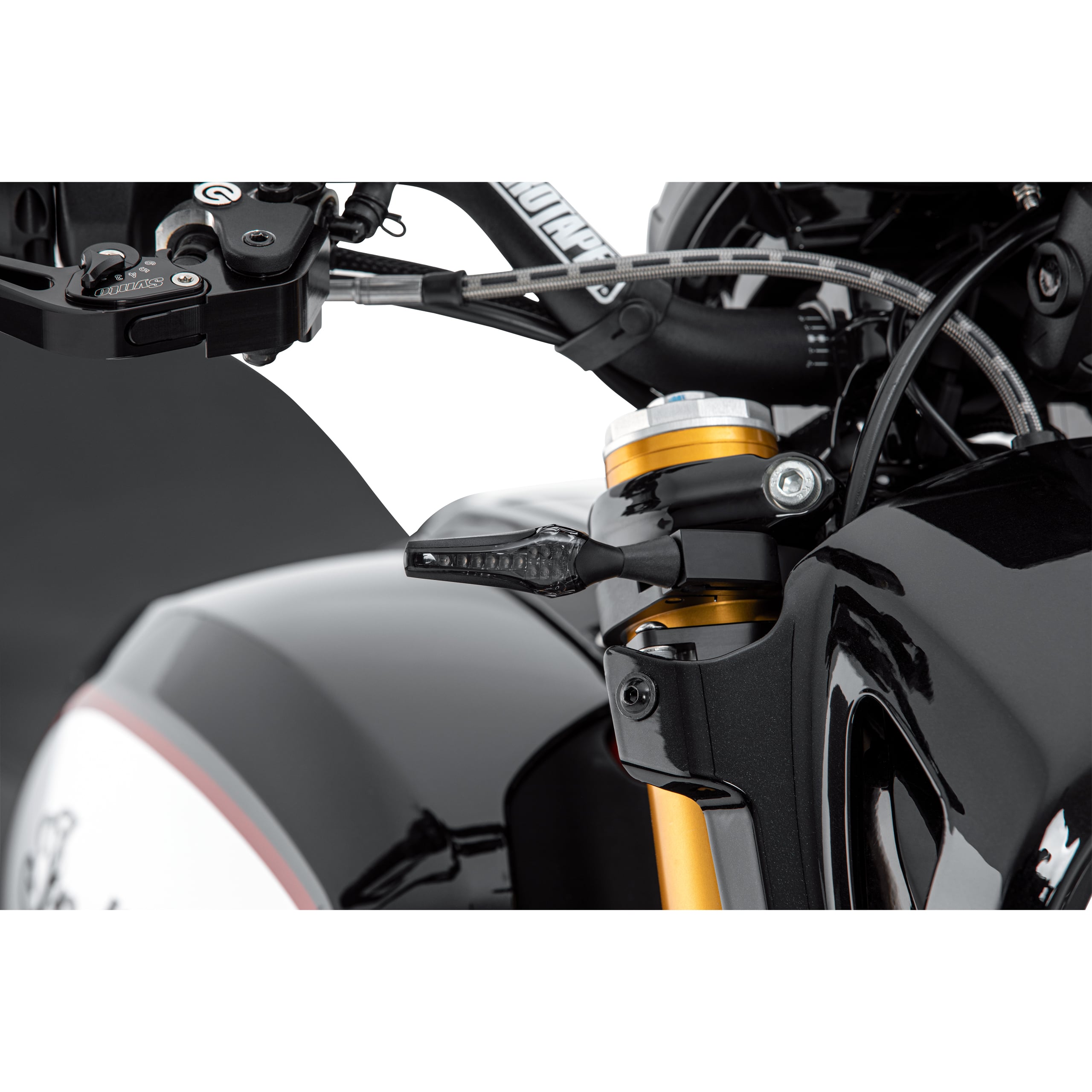 Das Design des Hashiru ST07 Blinkerpaars folgt einer klaren Linie, die auf Funktionalität und eine dezente Ästhetik setzt. Das schlanke Profil und die schwarze Gehäusefarbe bilden eine zurückhaltende Basis, die die Linienführung des Motorrads unterstreicht, anstatt sie zu dominieren. Das getönte Glas verleiht dem Blinker eine moderne Note und sorgt für ein einheitliches Erscheinungsbild, wenn die Beleuchtung nicht aktiv ist. Der Lauflicht-Effekt ist dynamisch, aber nicht übertrieben und lenkt den Blick gezielt auf die Blinkerfunktion, ohne vom Gesamteindruck des Fahrzeugs abzulenken. Diese Designphilosophie macht die Hashiru ST07 Blinker zu einer vielseitigen Ergänzung für eine breite Palette von Motorradstilen.
