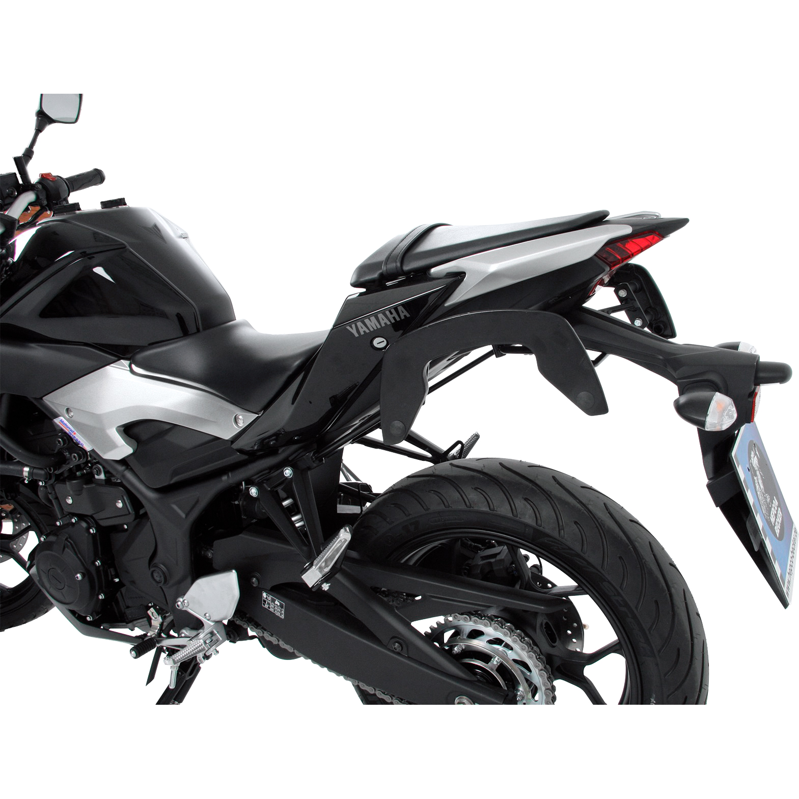 Ganz im Gegenteil. Die C-Bow Halterungen sind so gestaltet, dass sie sich harmonisch in das Design der Yamaha MT-03 integrieren. Die schlanke Konstruktion und die schwarze Pulverbeschichtung sorgen für eine unauffällige und sportliche Optik, die den Charakter des Motorrads unterstreicht und nicht stört.