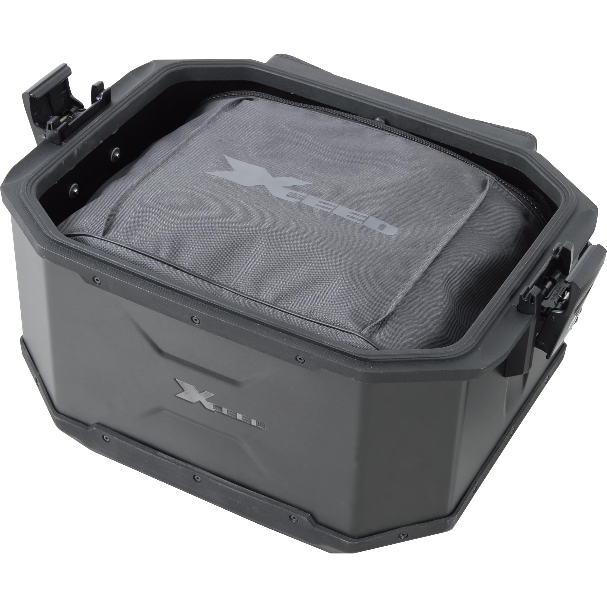 Die Tasche ist aus robusten Materialien gefertigt und mit verstärkten Nähten ausgestattet, um auch bei voller Beladung eine hohe Stabilität zu gewährleisten. Die Kontur der Tasche ist so gewählt, dass sie perfekt in das Xceed Topcase passt und dort sicher positioniert ist. Die integrierten Tragegriffe sind ebenfalls robust und für das Gewicht der voll beladenen Tasche ausgelegt.