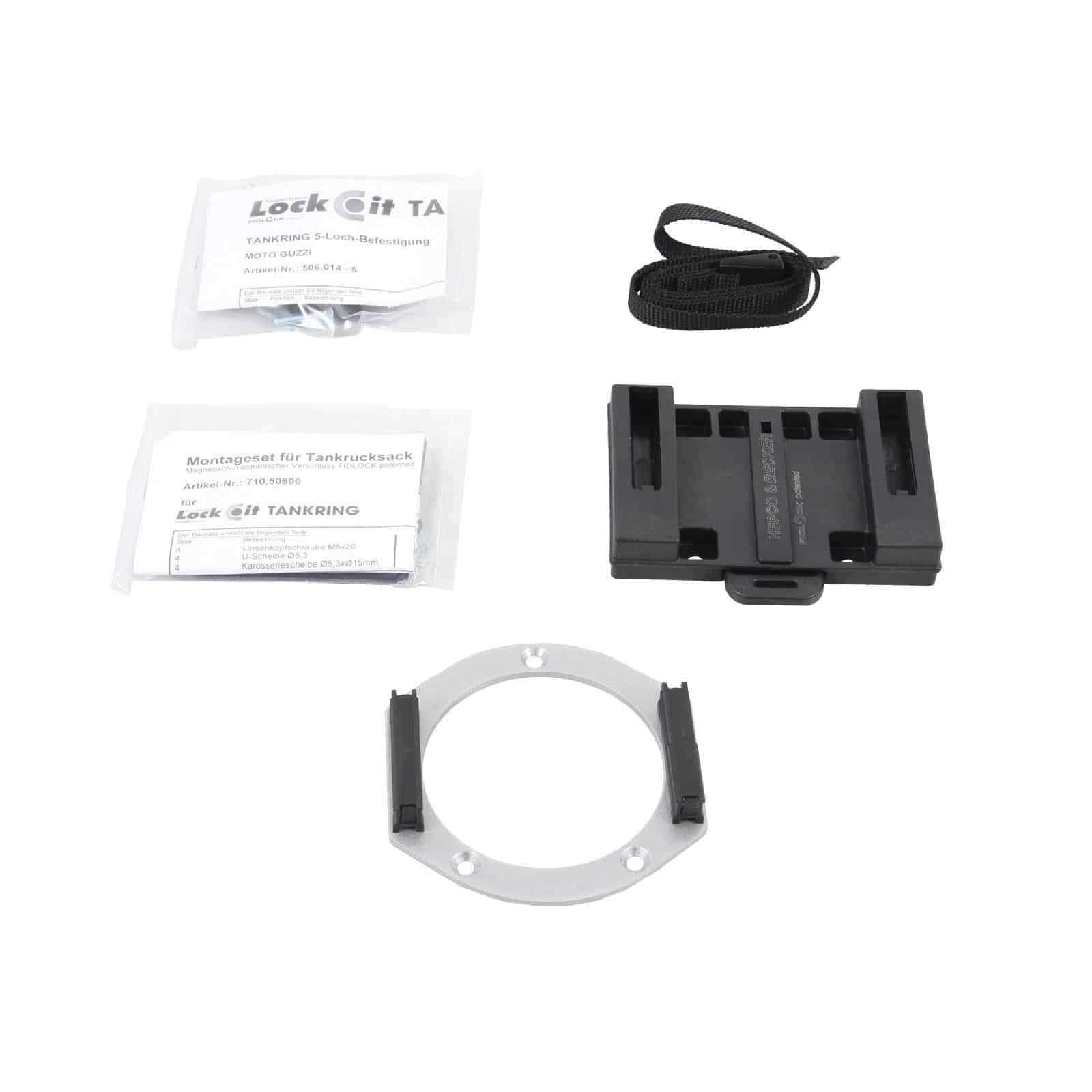| Konstruktion | Ein zweiteiliges System, bestehend aus einem fest montierten Adapterring am Motorrad und einem Aufnahmeelement am Tankrucksack. Die Verriegelung erfolgt durch ein bewährtes Klick-Mechanismus-System, das für seine einfache Bedienung und sichere Haltbarkeit bekannt ist. |