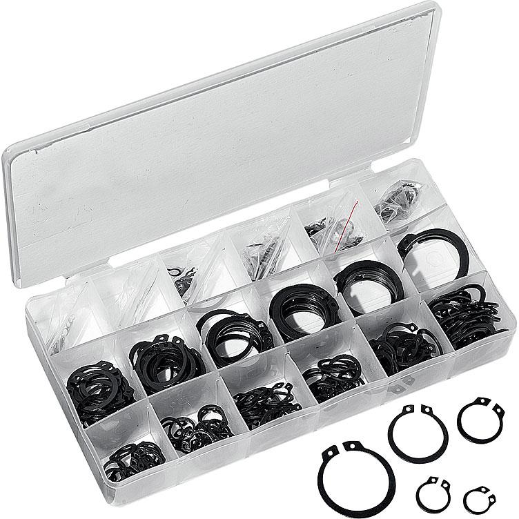 Dieses Sortiment enthält eine breite Palette an gängigen Sprengringen, darunter sowohl Innen- als auch Außenringe. Die 18 verschiedenen Größen decken eine Vielzahl von Wellen- und Bohrungsdurchmessern ab, die typischerweise im Motorradbau und in der allgemeinen Mechanik vorkommen.