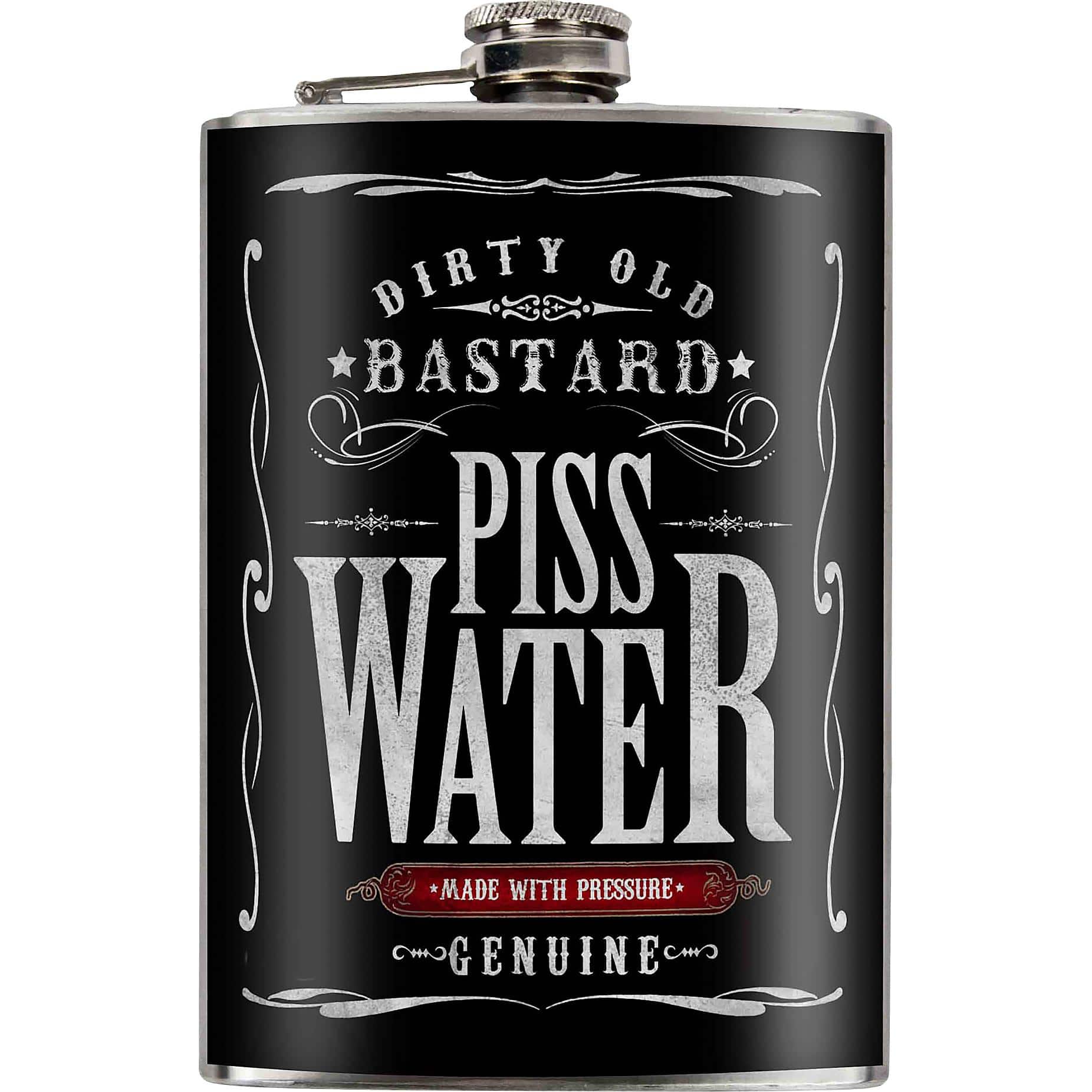 - Einzigartiges Design: Der provokante „Piss Water“-Schriftzug verleiht dem Flachmann einen humorvollen und charakterstarken Look, der ihn von anderen abhebt.