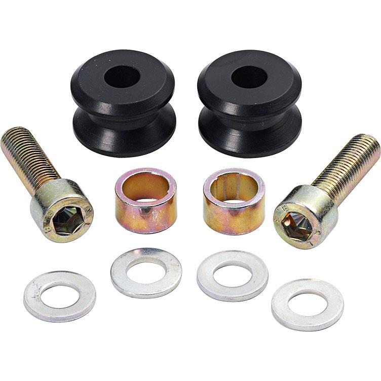 Die Montage ist sehr einfach. Die Adapterrollen werden von unten in die Gewindebuchsen der Schwinge Ihres Motorrads eingeschraubt. Sie sollten fest und gerade eingedreht werden, um einen sicheren Sitz zu gewährleisten. Achten Sie darauf, das passende Gewindemaß zu wählen, das Ihrer Schwinge entspricht.