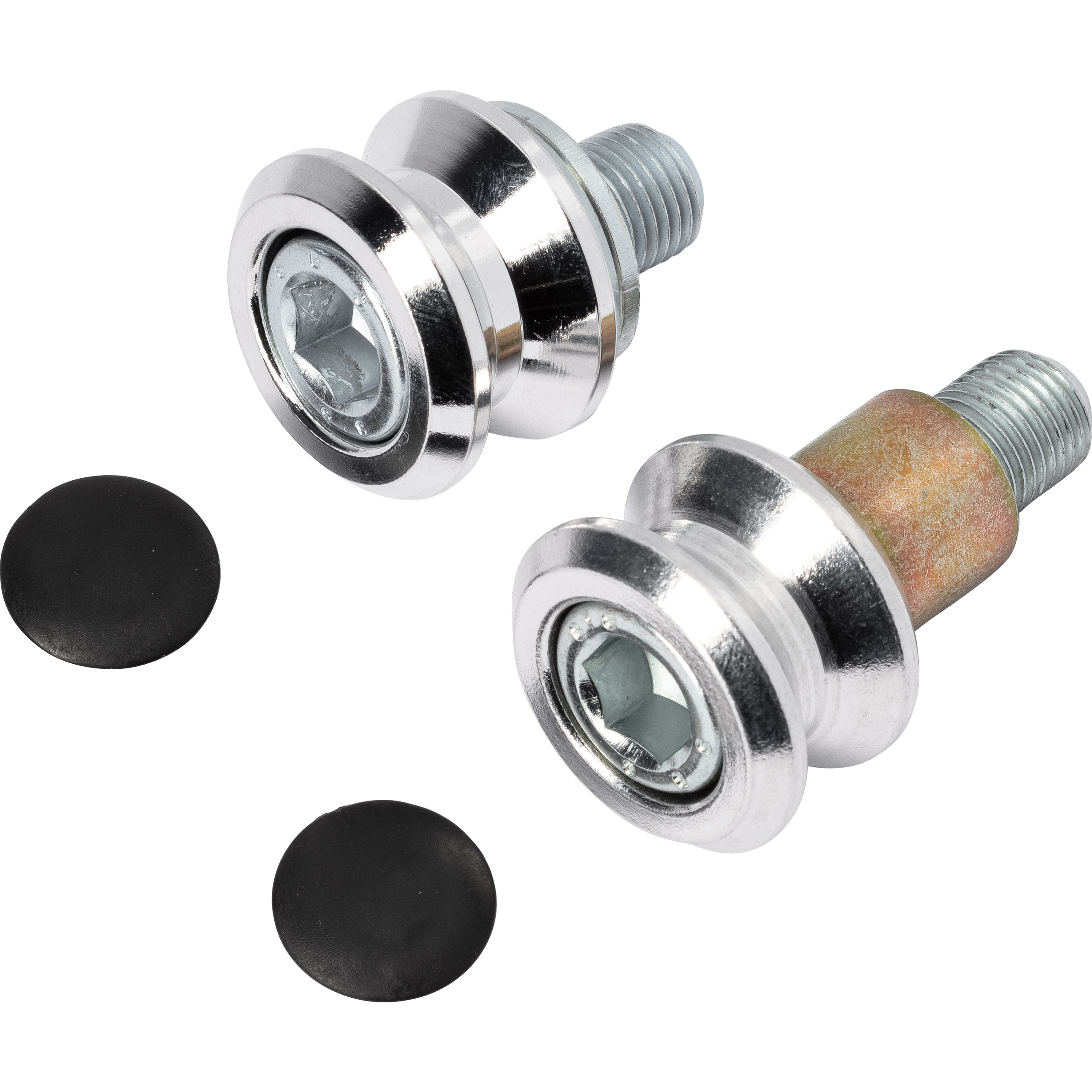 Die Adapterrollen werden direkt in die dafür vorgesehenen Gewindeaufnahmen an der Schwinge Ihres Motorrads eingeschraubt. Anschließend wird der Montageständer auf diese Rollen aufgesetzt, um das Motorrad anzuheben.