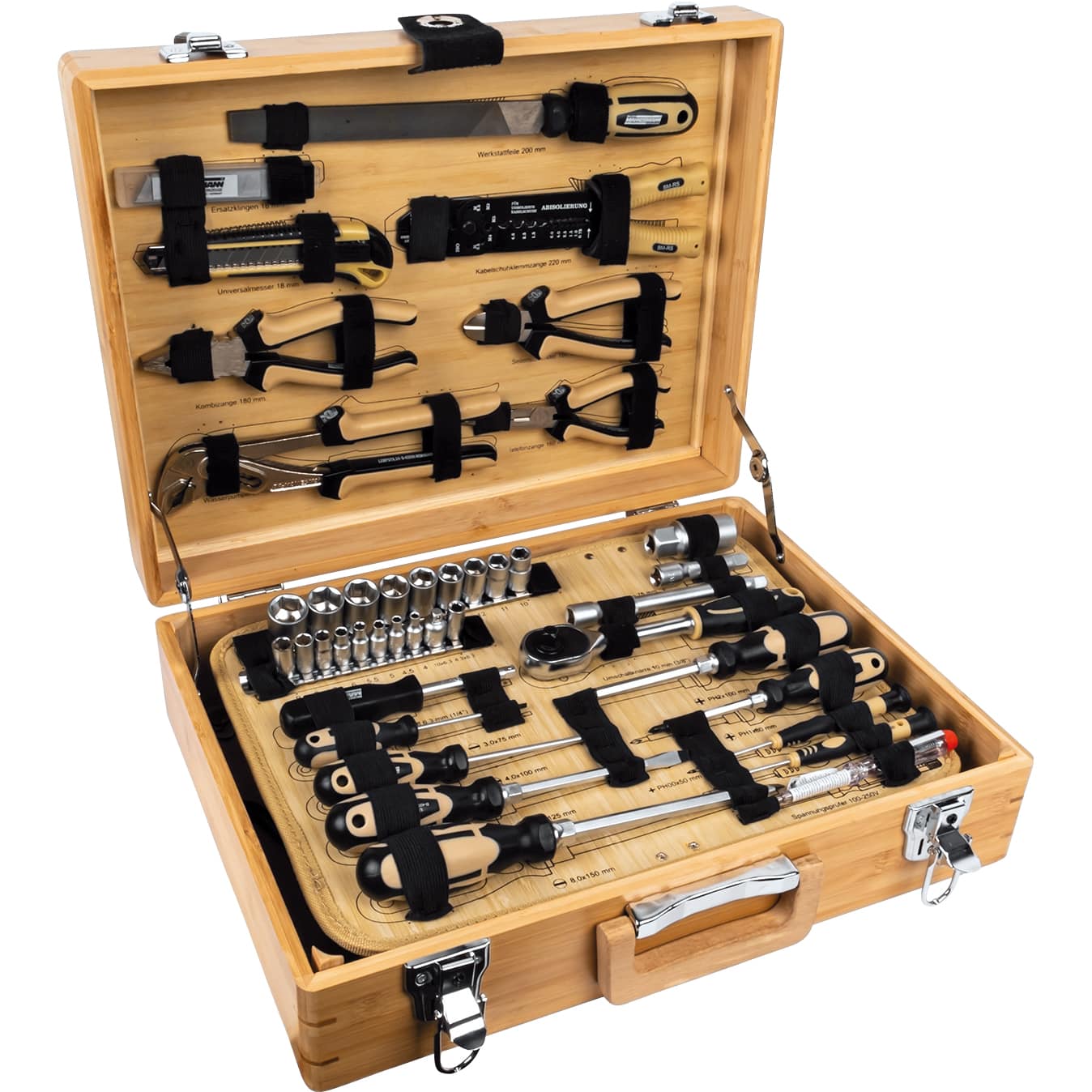 Ein besonderes Merkmal dieses Werkzeugkoffers ist sein Gehäuse aus hochwertigem Bambus. Bambus ist nicht nur ein schnell nachwachsender Rohstoff und somit eine umweltfreundliche Alternative zu herkömmlichen Materialien, sondern verleiht dem Koffer auch eine einzigartige, natürliche Ästhetik. Die Haptik des Bambus ist angenehm und warm, während die natürliche Maserung jedes Exemplar zu einem Unikat macht. Dieses Design fügt sich harmonisch in jede Werkstattumgebung ein und unterstreicht Ihr Bewusstsein für nachhaltige Produkte.