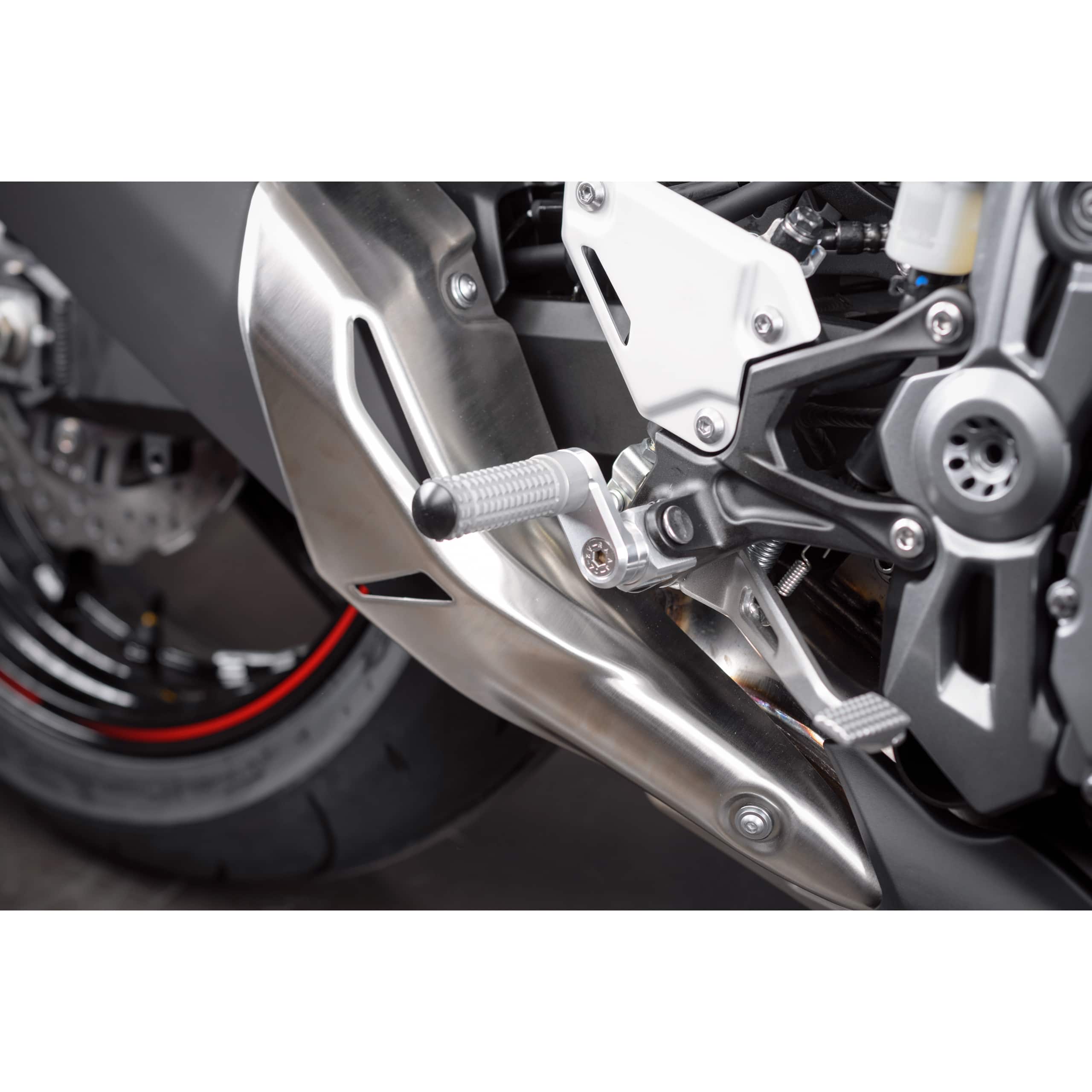 Das Design der Mizu Flex Race Fußrasten folgt einer klaren Ästhetik, die sich nahtlos in das sportliche Erscheinungsbild moderner Motorräder integriert. Die Kombination aus der satinierten Silberoberfläche und den präzise gefrästen Konturen verleiht dem Motorrad eine Veredelung und unterstreicht die Leidenschaft des Besitzers für hochwertige Komponenten. Diese Fußrasten sind nicht nur ein funktionales Bauteil, sondern auch ein optisches Statement.