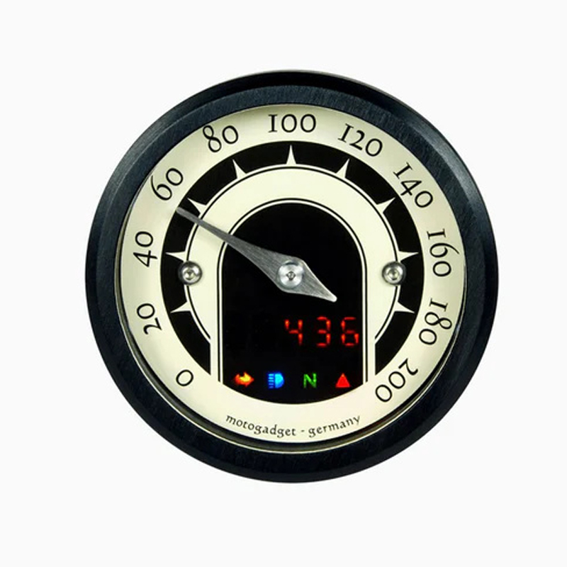 Der Motogadget Tacho motoscope tiny speedster (49 mm) mit schwarzem Ring ist die ideale Wahl für Motorradfahrer, die Wert auf höchste Präzision, klare Ablesbarkeit und ein minimalistisches, hochwertiges Design legen. Dieses digitale Instrument vereint modernste Technologie mit einer kompakten Bauweise und verwandelt Ihr Cockpit in ein funktionales Meisterwerk. Es eignet sich perfekt für Umbauten, Cafe Racer, Scrambler, Bobber und alle Custom-Projekte, bei denen ein dezentes, aber aussagekräftiges Cockpit im Vordergrund steht.