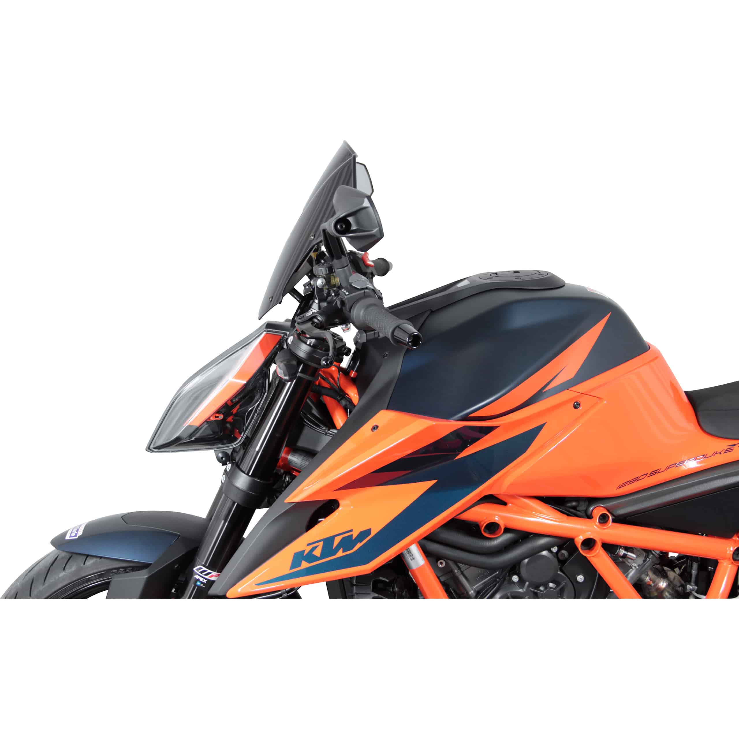 - Sportliche Optik: Die schwarze Tönung und das dezente Design unterstreichen den aggressiven Look der KTM 1290 Super Duke R.