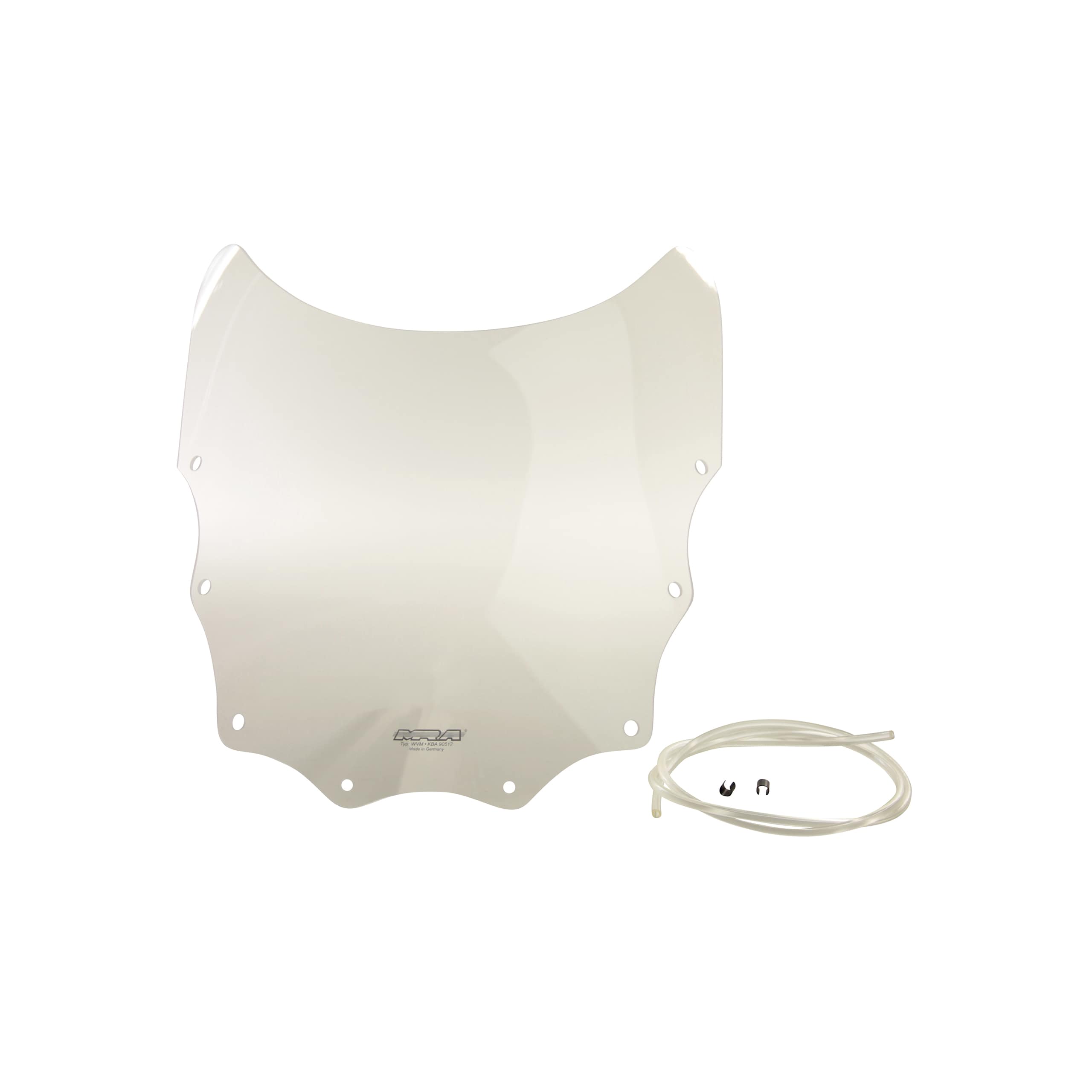 Die MRA Verkleidungsscheibe Spoiler S wird aus hochwertigem Acrylglas (PMMA) gefertigt. Dieses Material ist bekannt für seine hervorragende Transparenz, Schlagfestigkeit und Witterungsbeständigkeit. Die klare Ausführung gewährleistet eine uneingeschränkte Sicht nach vorne, ohne die Wahrnehmung von Farben oder Lichtverhältnissen zu beeinträchtigen. Die Kanten der Scheibe sind sorgfältig abgerundet und poliert, was nicht nur die Optik aufwertet, sondern auch ein wesentliches Sicherheitsmerkmal darstellt. Diese Verarbeitung minimiert das Risiko von Verletzungen bei einem Sturz oder bei der Handhabung.