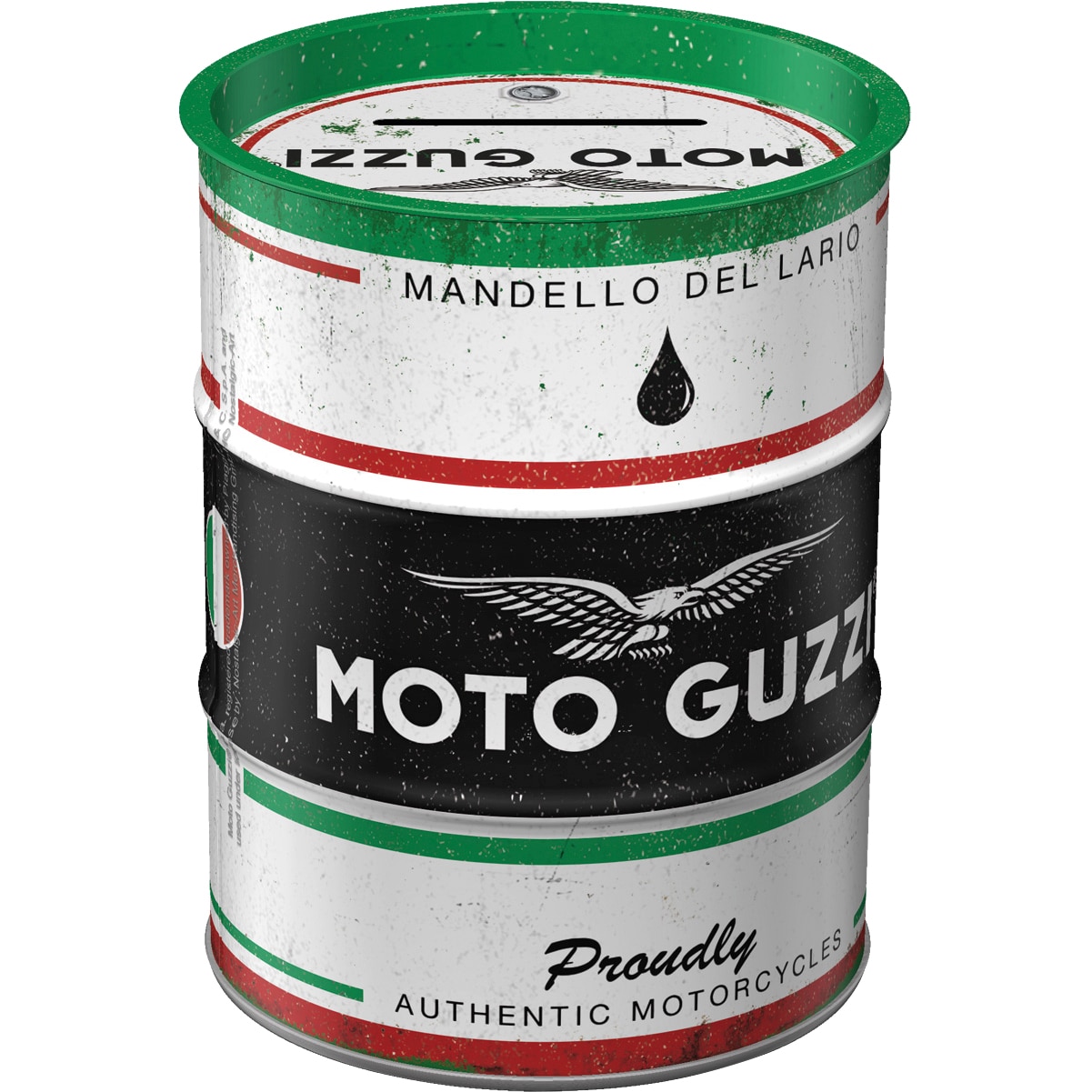 Diese exklusive Nostalgic-Art Spardose im authentischen Ölfass-Design ist das ideale Accessoire für jeden Liebhaber italienischer Motorradkultur und ein stilvolles Aufbewahrungsutensil für Ihr Kleingeld. Mit ihrem detailreichen Aufdruck „Moto Guzzi – Italian Motorcycle Oil“ spricht sie gezielt Sammler und Fans der traditionsreichen Marke an und eignet sich hervorragend als originelle Geschenkidee für Geburtstage, Weihnachten oder als Aufmerksamkeit für besondere Anlässe.