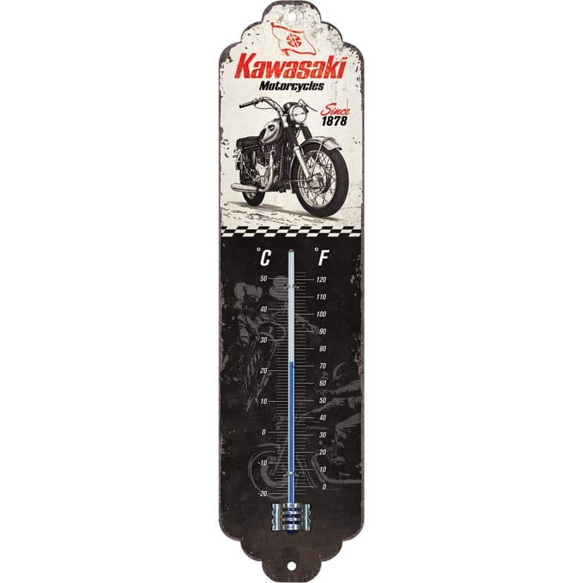 Das Thermometer präsentiert sich im klassischen Stil, der die reiche Geschichte von Kawasaki würdigt. Das prägnante „Kawasaki – Since 1878“ Logo, kombiniert mit weiteren typischen Designelementen der Marke, macht dieses Stück zu einem echten Blickfang. Die Herstellung erfolgt bei Nostalgic-Art, einem Unternehmen, das für seine hochwertigen Blechschilder und Accessoires mit Retro-Charme bekannt ist. Dieser Fokus auf Qualität und Authentizität stellt sicher, dass das Thermometer nicht nur gut aussieht, sondern auch langlebig ist.