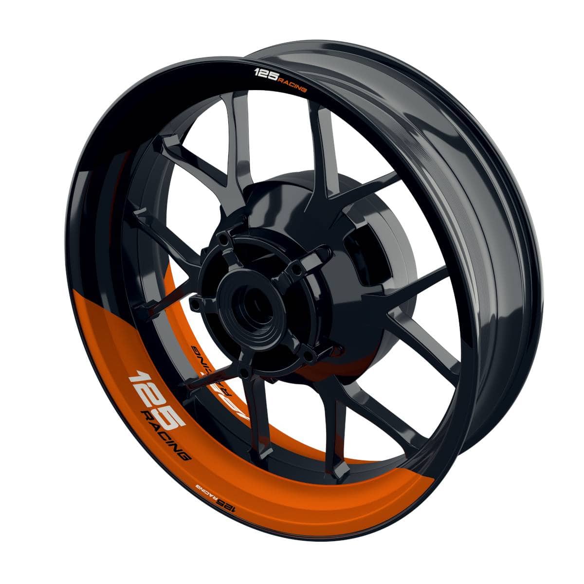 „Geteilt halb halb“ beschreibt die grafische Aufteilung des Designs auf der Felge. Das bedeutet, dass die orange glänzende Farbe und das „125 Racing“-Motiv die Felge in zwei Hälften teilen, was einen symmetrischen und dynamischen visuellen Effekt erzeugt. Dies ermöglicht eine attraktive Gestaltung sowohl der inneren als auch der äußeren Felgenbereiche.
