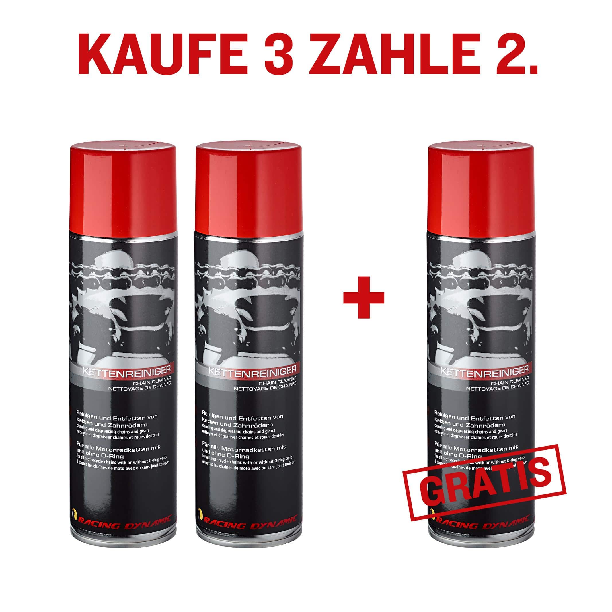 Das Angebot bedeutet, dass Sie beim Kauf von drei Flaschen des Racing Dynamic Kettenreinigers nur den Preis für zwei Flaschen bezahlen. Sie erhalten also eine Flasche gratis.