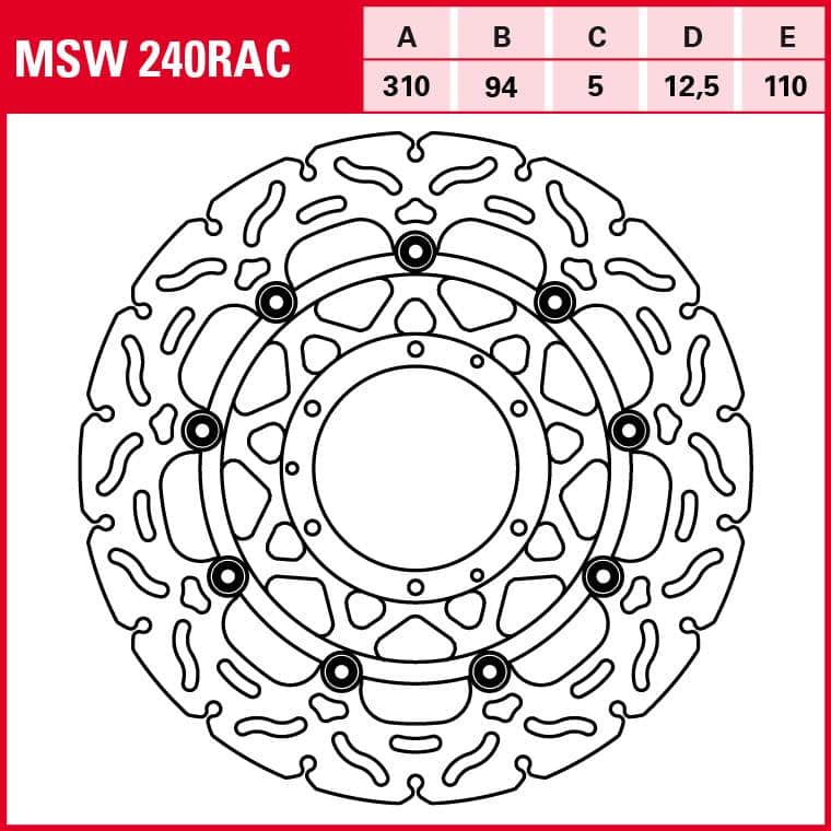 Die TRW Lucas Bremsscheibe RAC schwimmend MSW240RAC ist das Ergebnis jahrelanger Erfahrung im Motorsport und kontinuierlicher Forschung. Jedes Detail ist auf maximale Performance und Zuverlässigkeit ausgelegt. Der Außendurchmesser von 310 mm in Kombination mit der spezifischen Nabenbohrung (94 mm) und dem Lochkreis (110 mm) stellt eine exakte Passform für viele Motorradmodelle sicher. Die Dicke von 5 mm des Reibrings bietet eine hohe Materialreserve, während die Narbenbreite von 12,5 mm die Stabilität der gesamten Einheit gewährleistet. Die Konstruktion mit innenliegender Aluminium-Bremsscheibenaufnahme (Center Disc) und einem hochfesten Stahl-Reibring ist ein bewährtes System, das die Vorteile beider Materialien optimal nutzt: die Härte und Reibcharakteristik des Stahls und die Leichtigkeit sowie Wärmeabfuhr des Aluminiums.